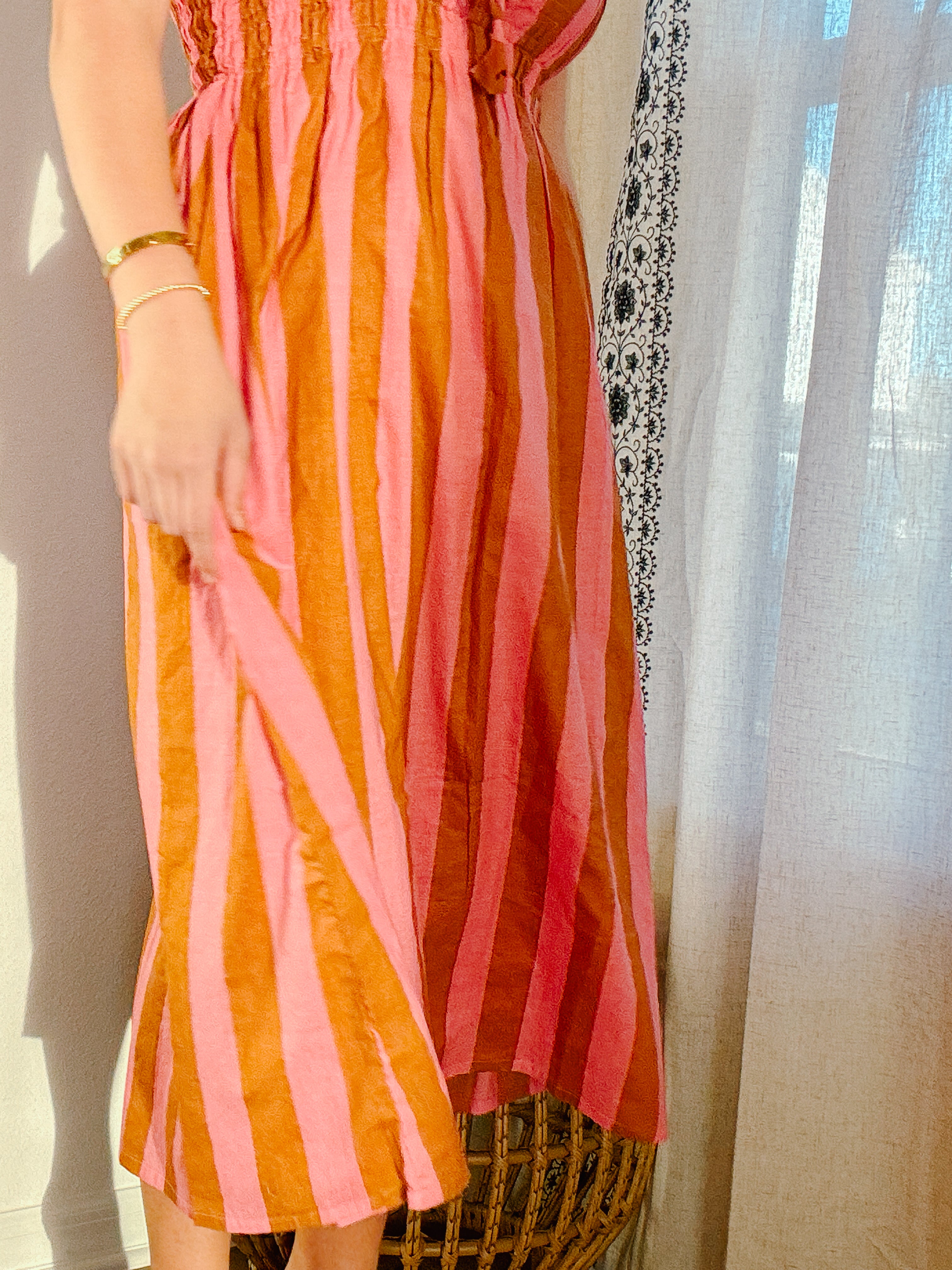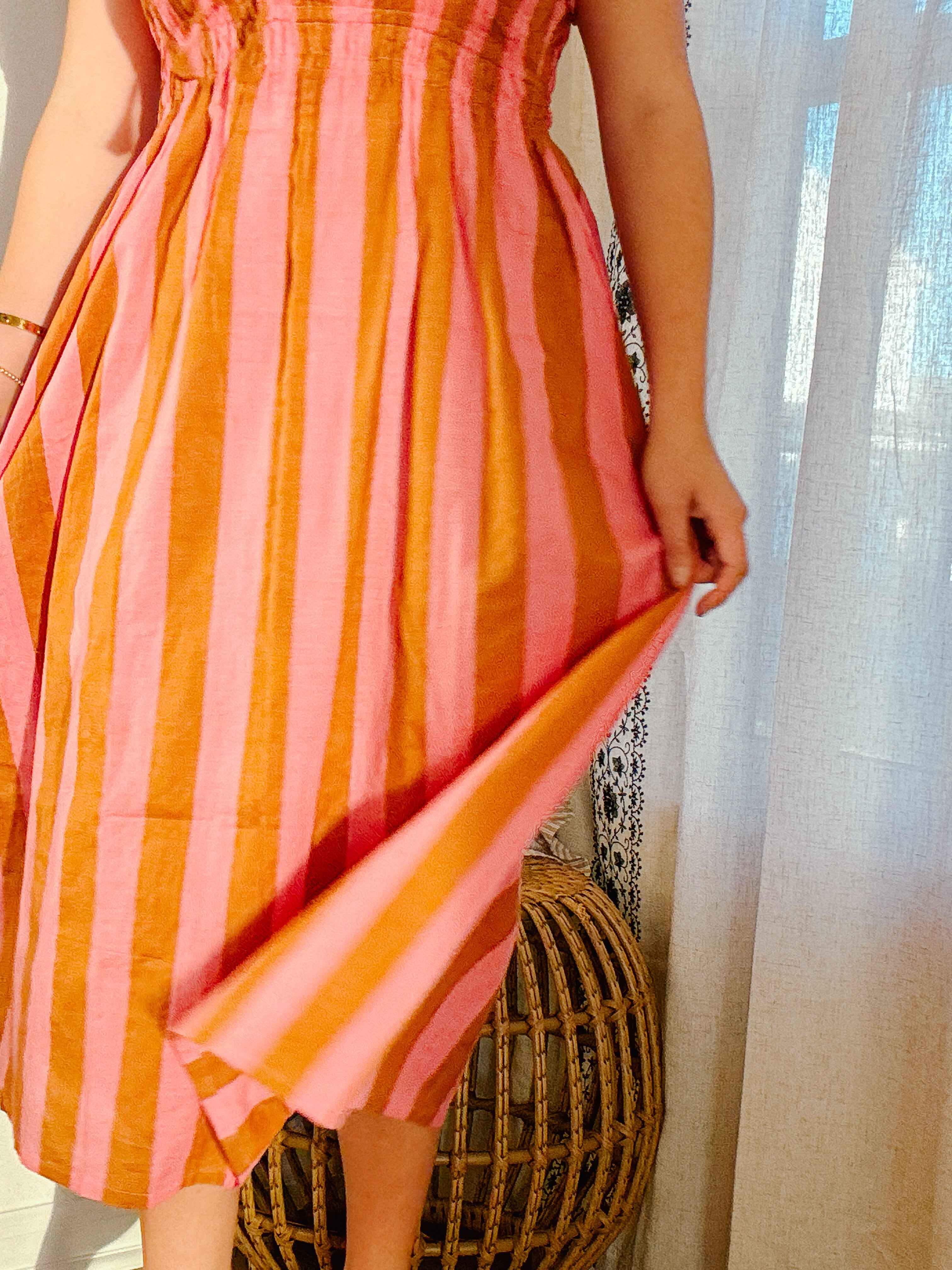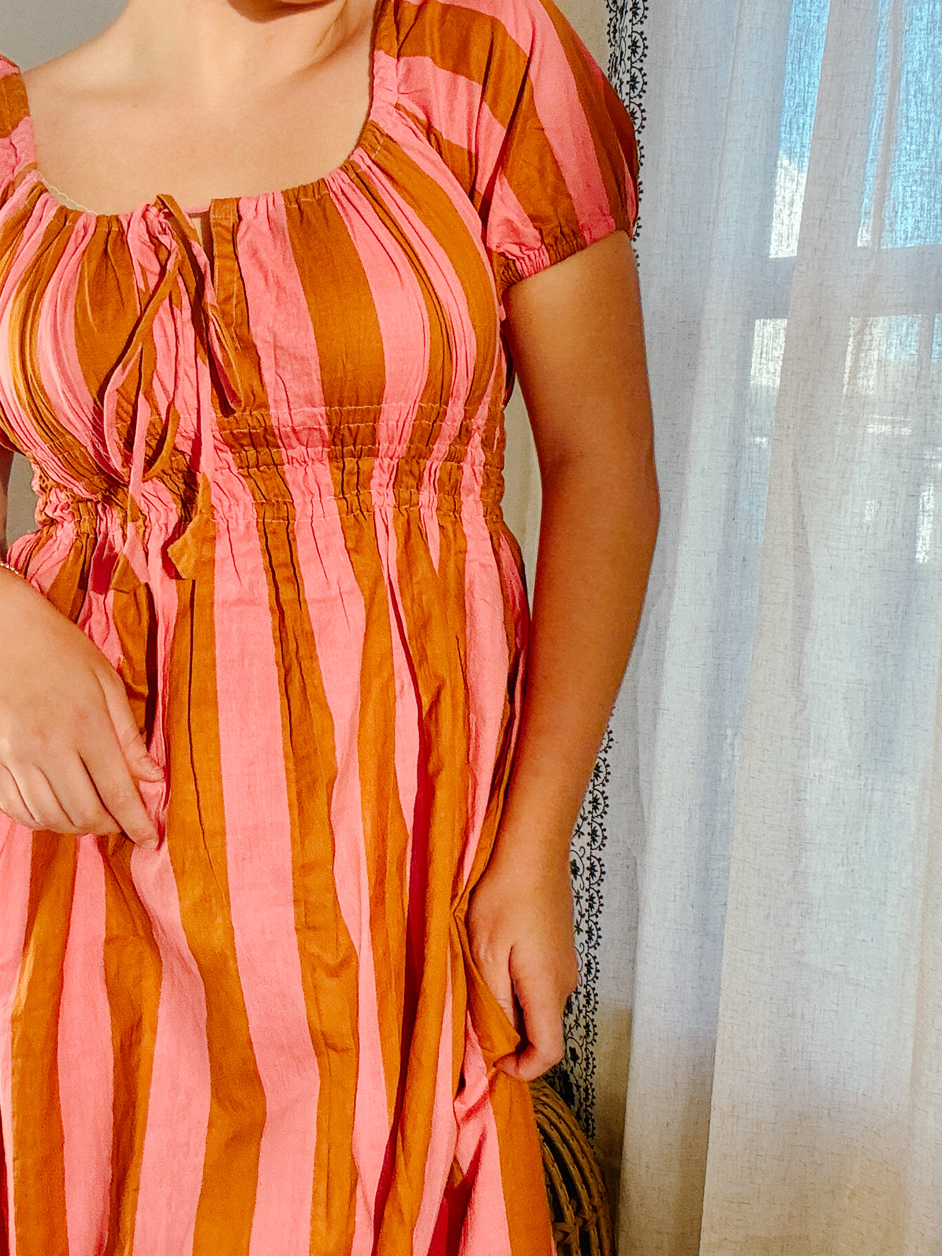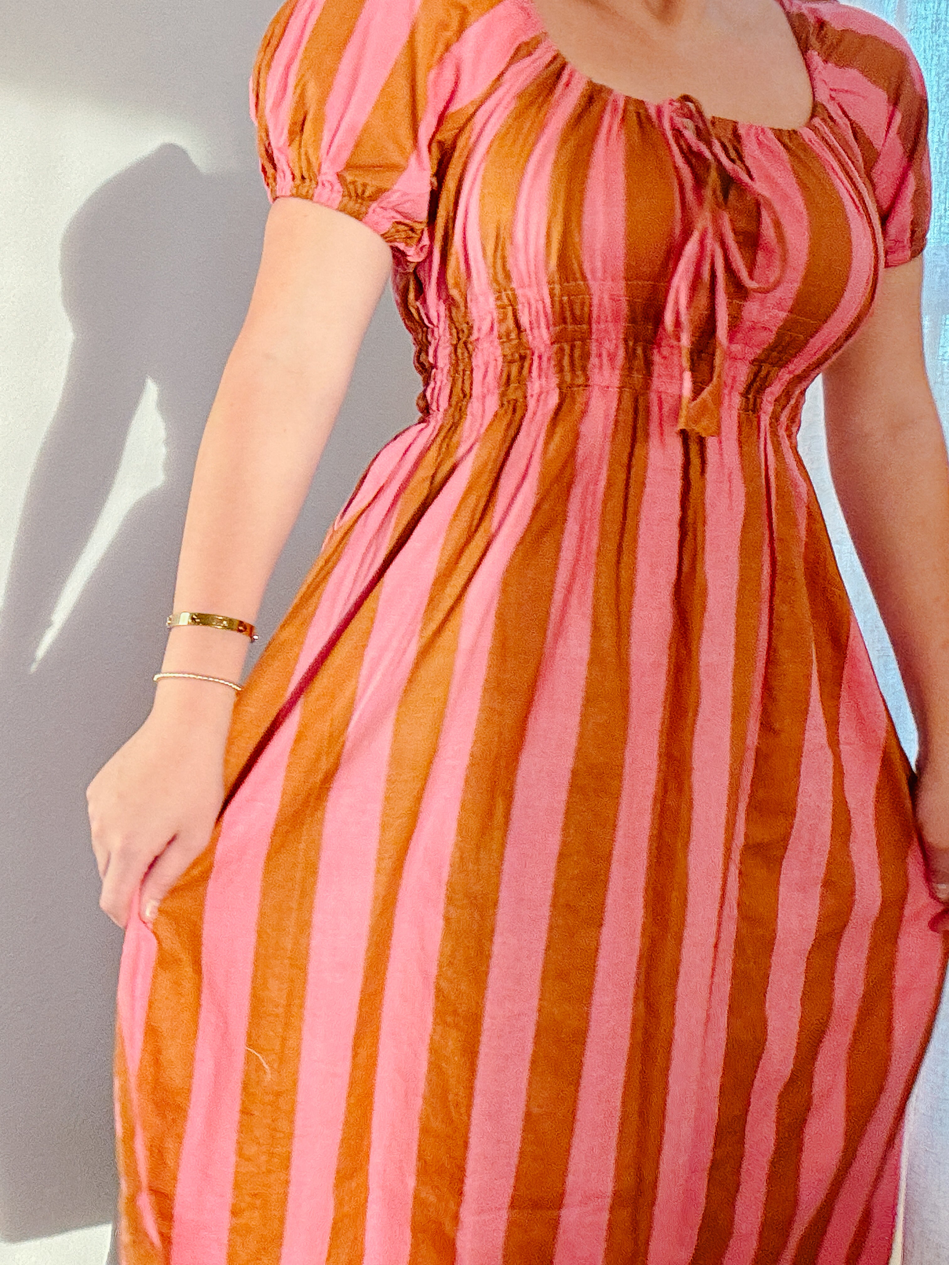 Designed for slow mornings and sunlit afternoons, the Sunday Puff Sleeve Dress is an effortless blend of charm and comfort. Crafted in soft, breathable cotton with classic white and red stripes, this silhouette features gently puffed sleeves, a flattering square neckline, and a softly smocked waist that moves with you. Finished with a delicate tie-front detail and an easy midi length, it’s the kind of dress you’ll reach for again and again—perfect for brunch, errands, or simply feeling put-together at home.