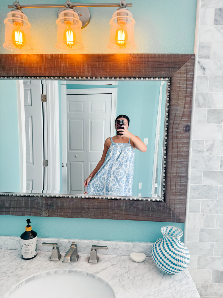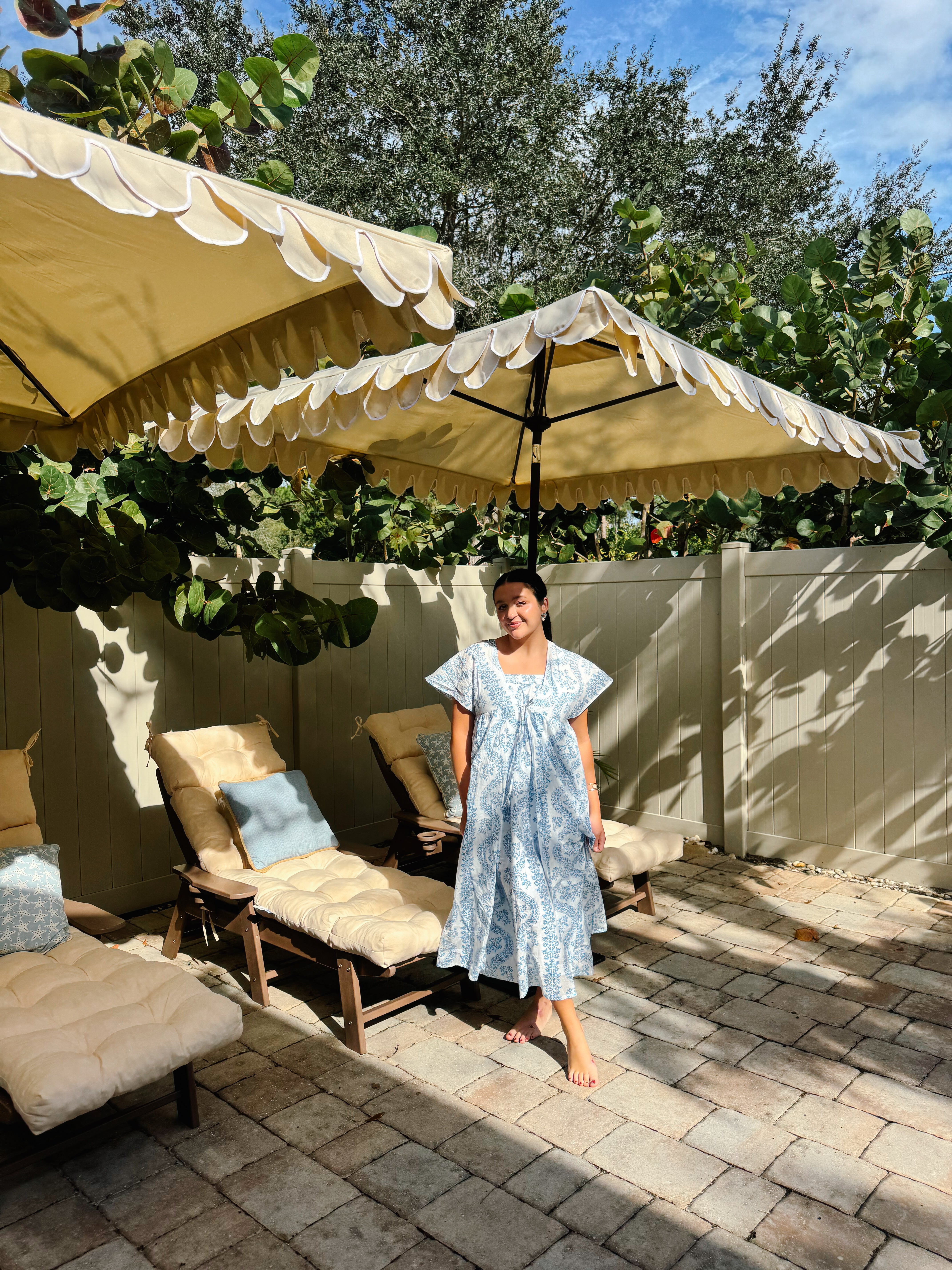 The Cottage Nightgown & Wrap Set features a fully lined, adjustable-strap nightgown paired with a matching short-sleeve wrap that ties in a sweet center bow. Done in our Coastal Vine print — a fresh white-and-blue floral — it’s effortless, feminine, and beautiful both in and out of bed.