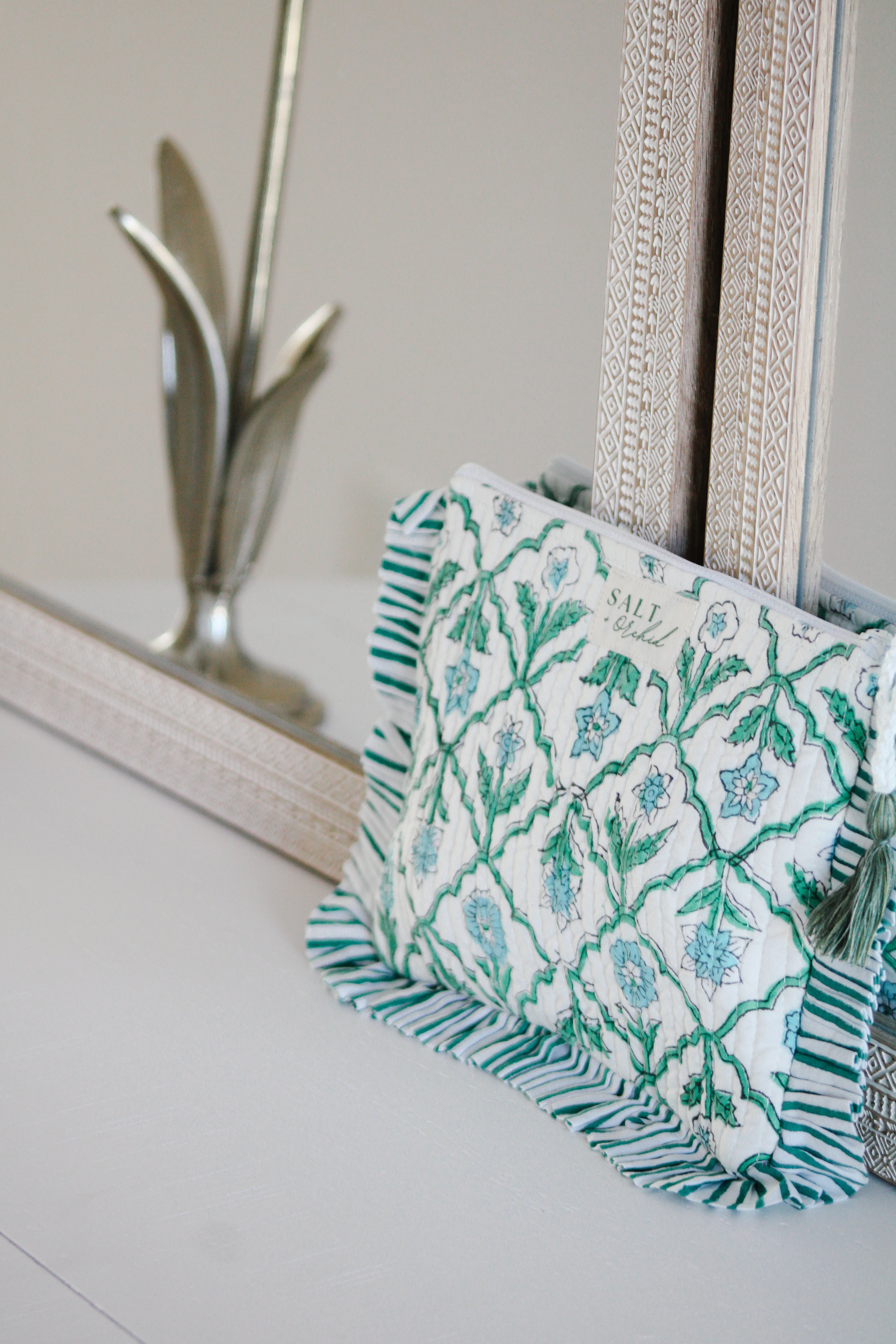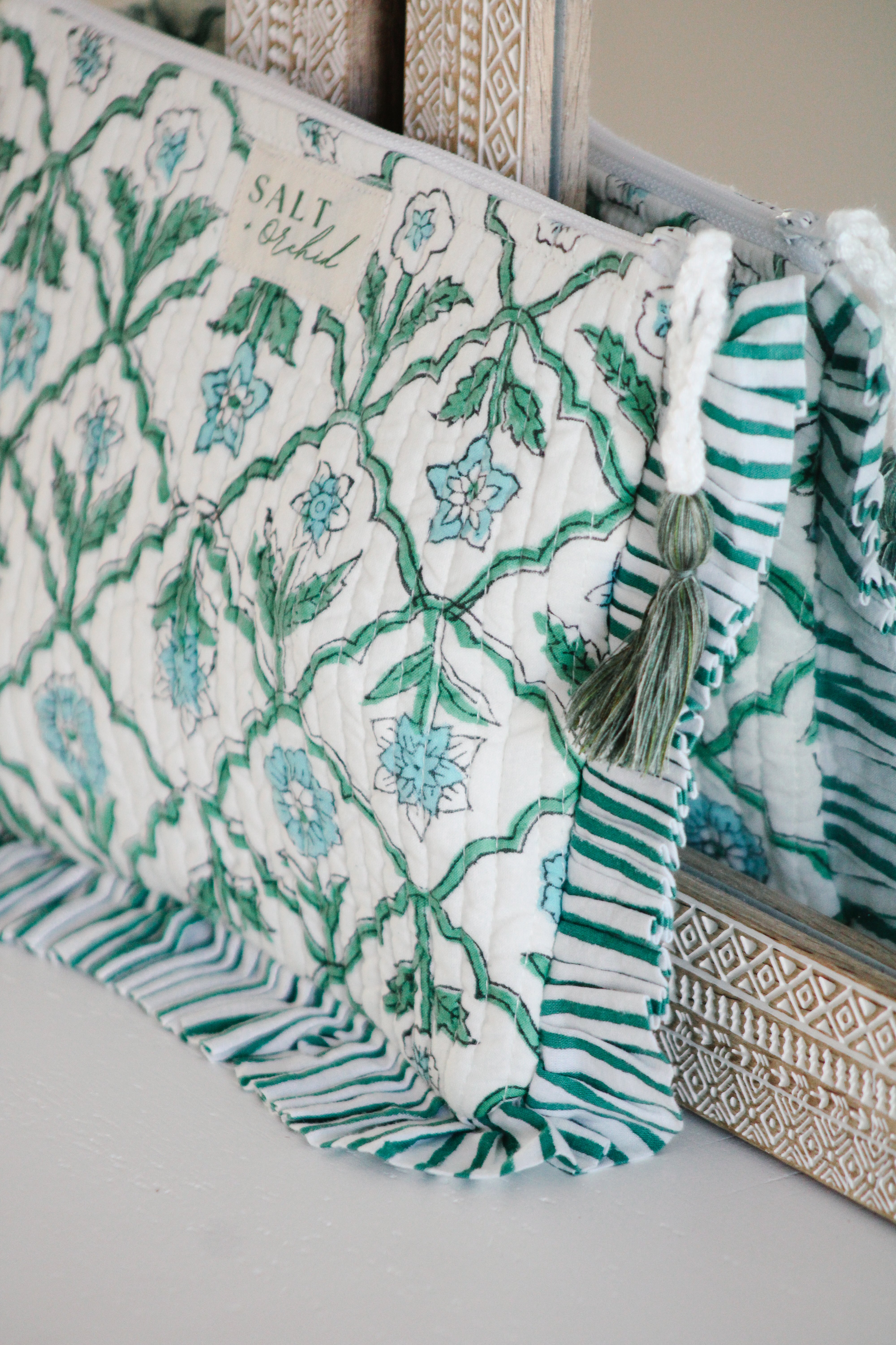 A softly quilted cotton pouch finished with delicate frills. Light, lined, and perfectly sized for everyday bits and pieces — from makeup to little keepsakes.