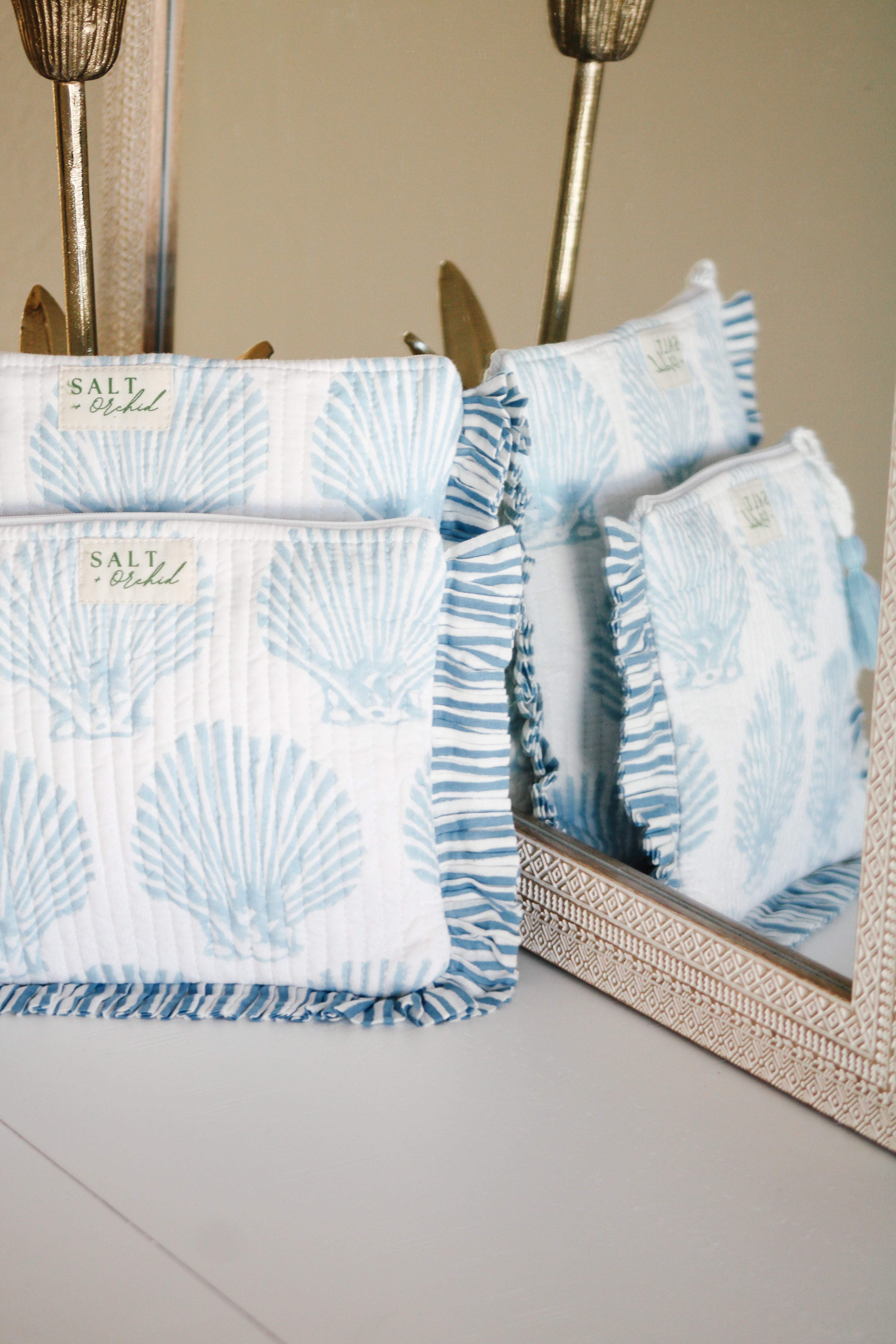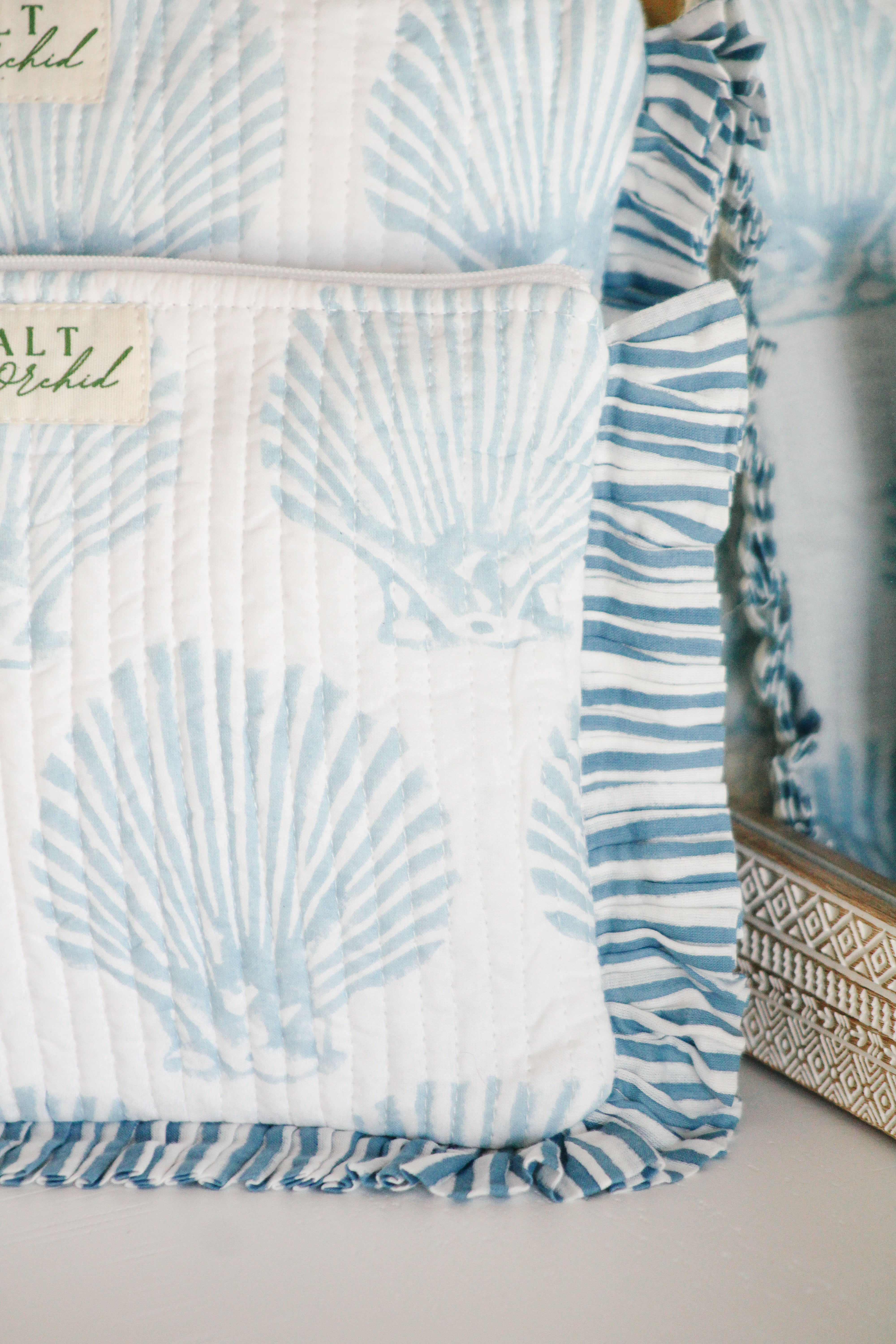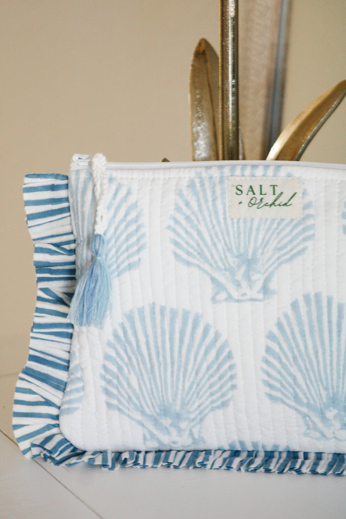 A softly quilted cotton pouch finished with delicate frills. Light, lined, and perfectly sized for everyday bits and pieces — from makeup to little keepsakes.
