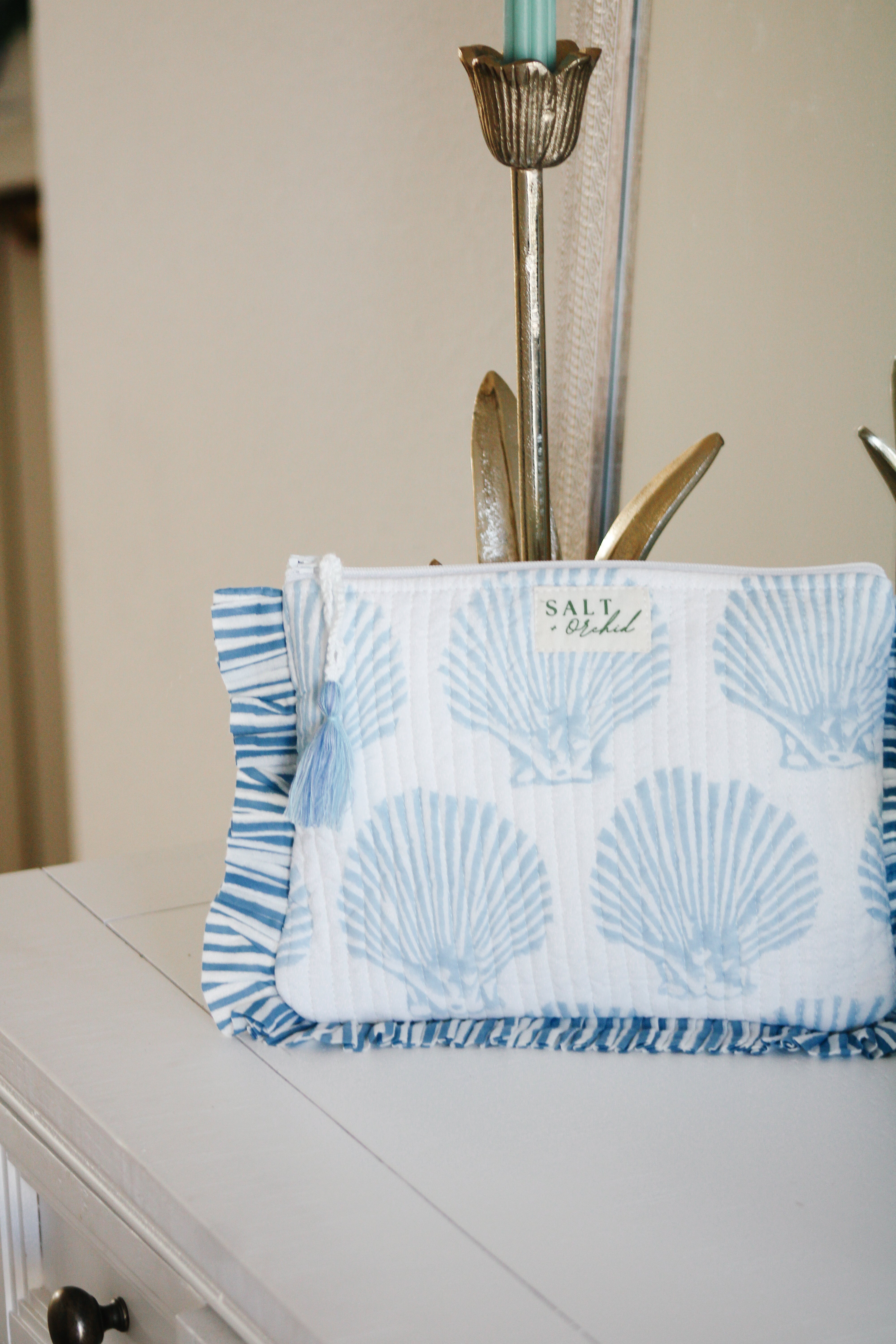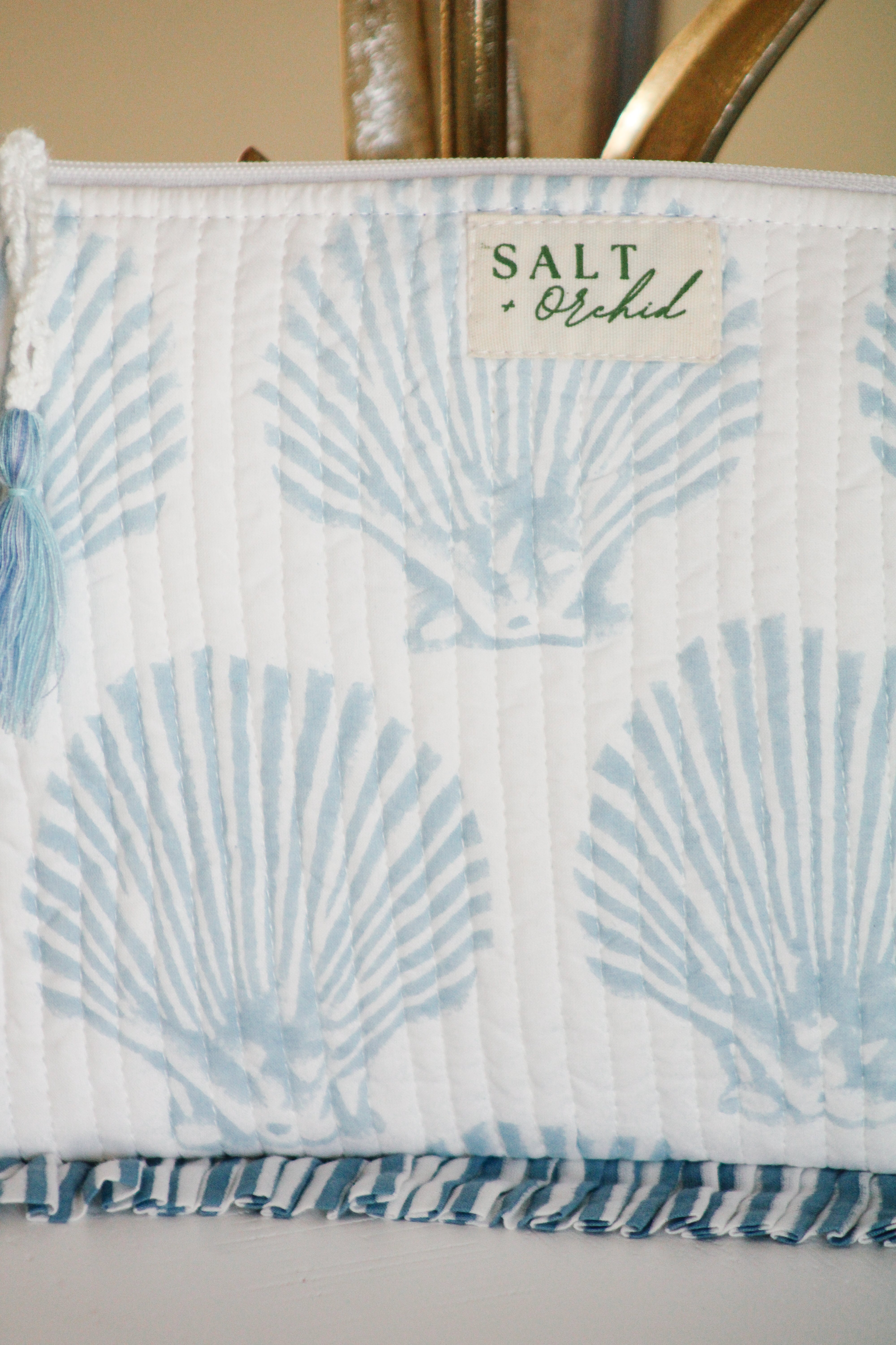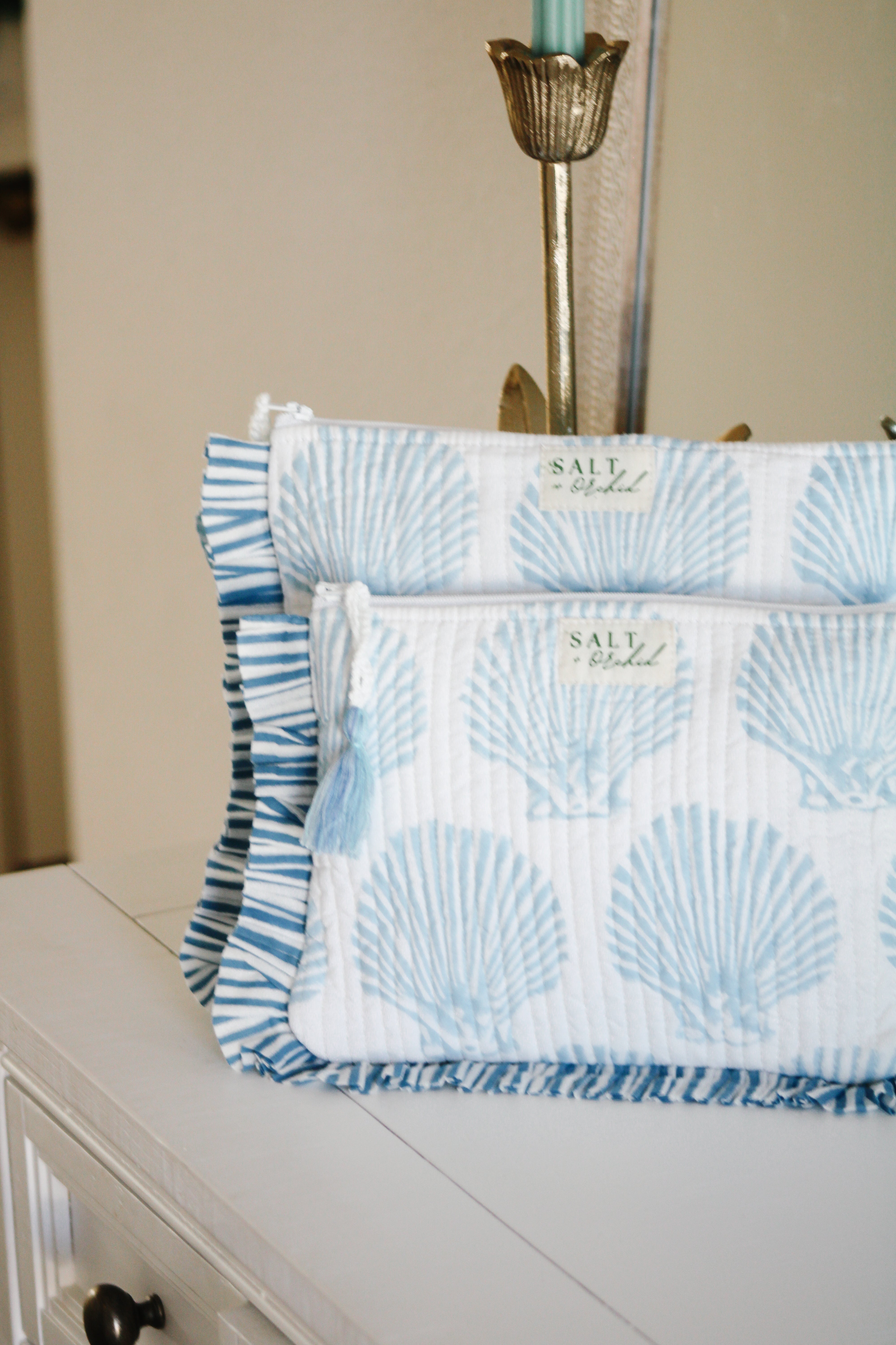 A softly quilted cotton pouch finished with delicate frills. Light, lined, and perfectly sized for everyday bits and pieces — from makeup to little keepsakes.