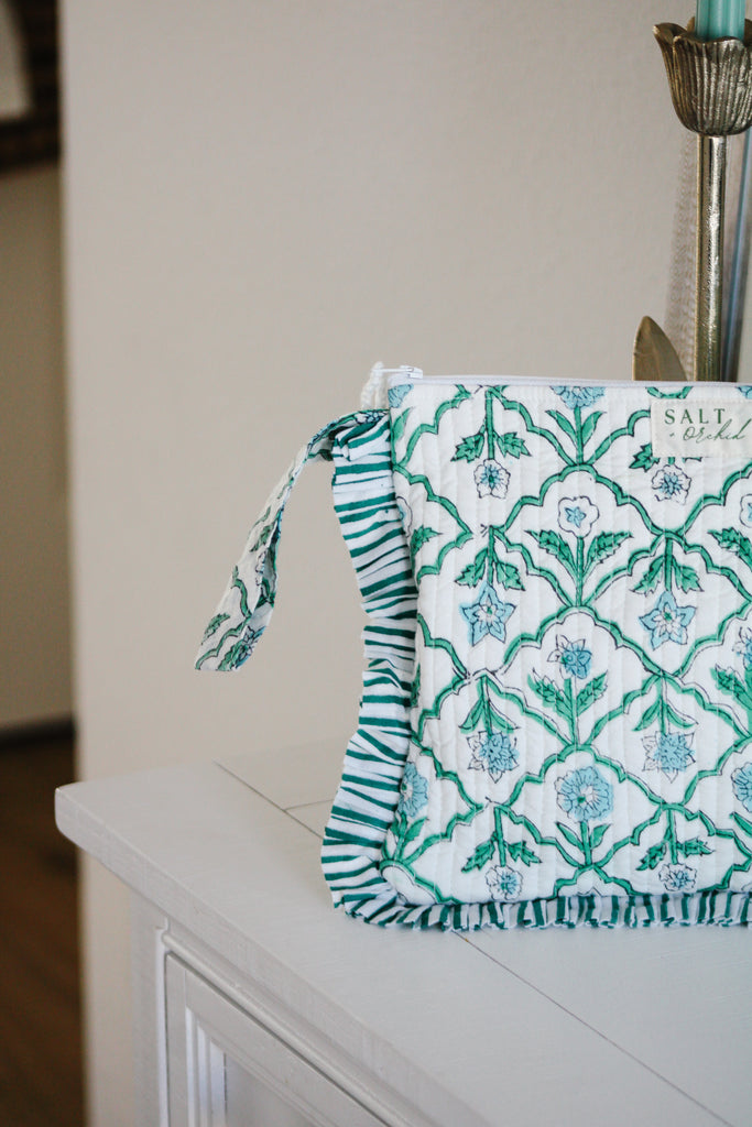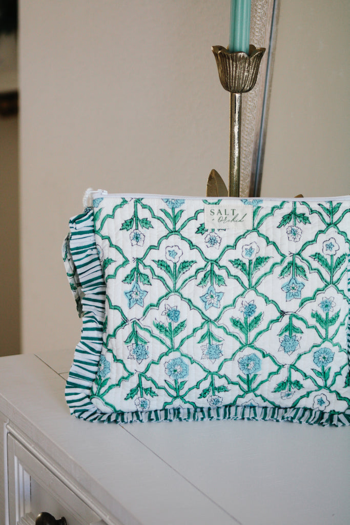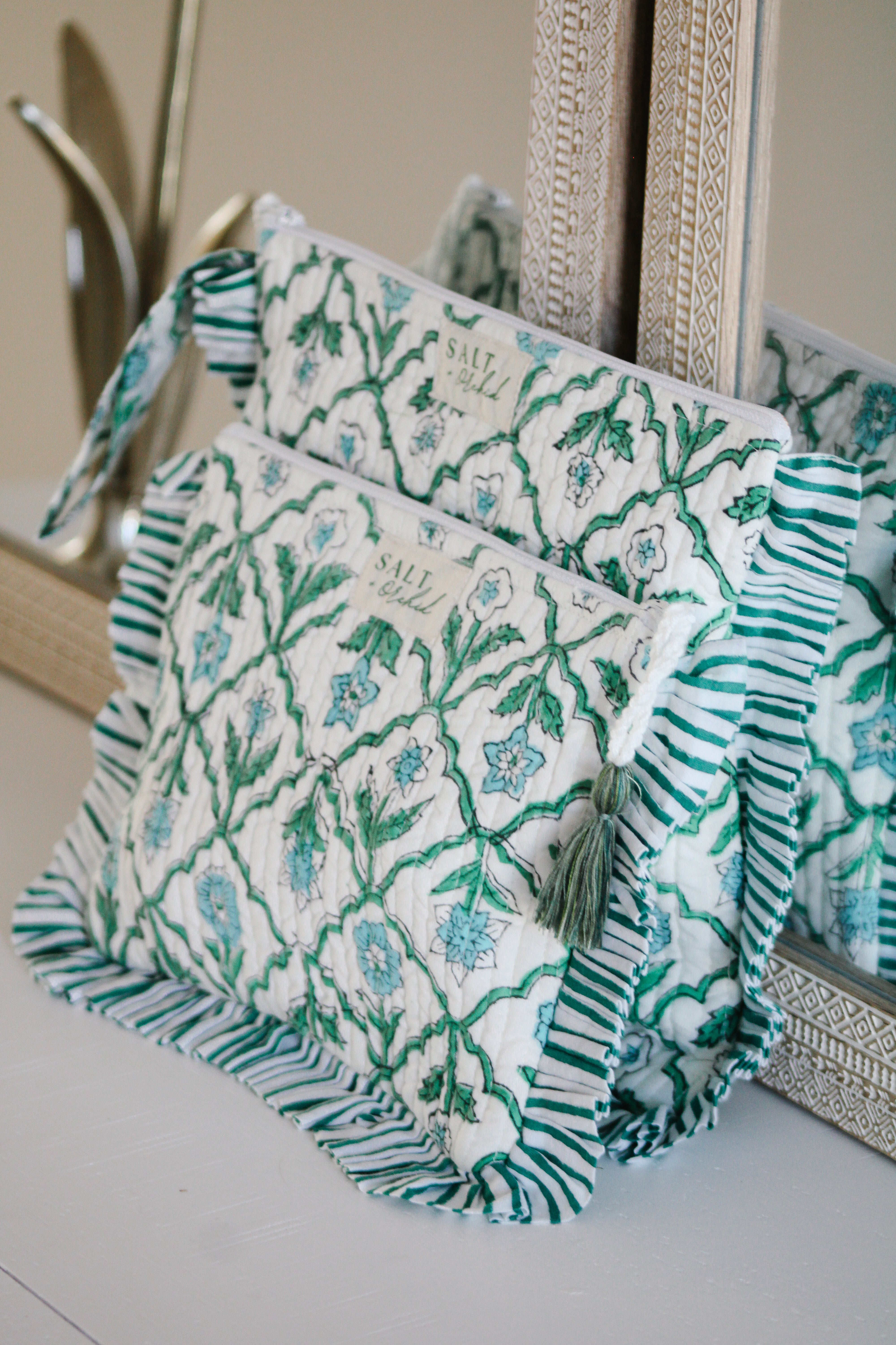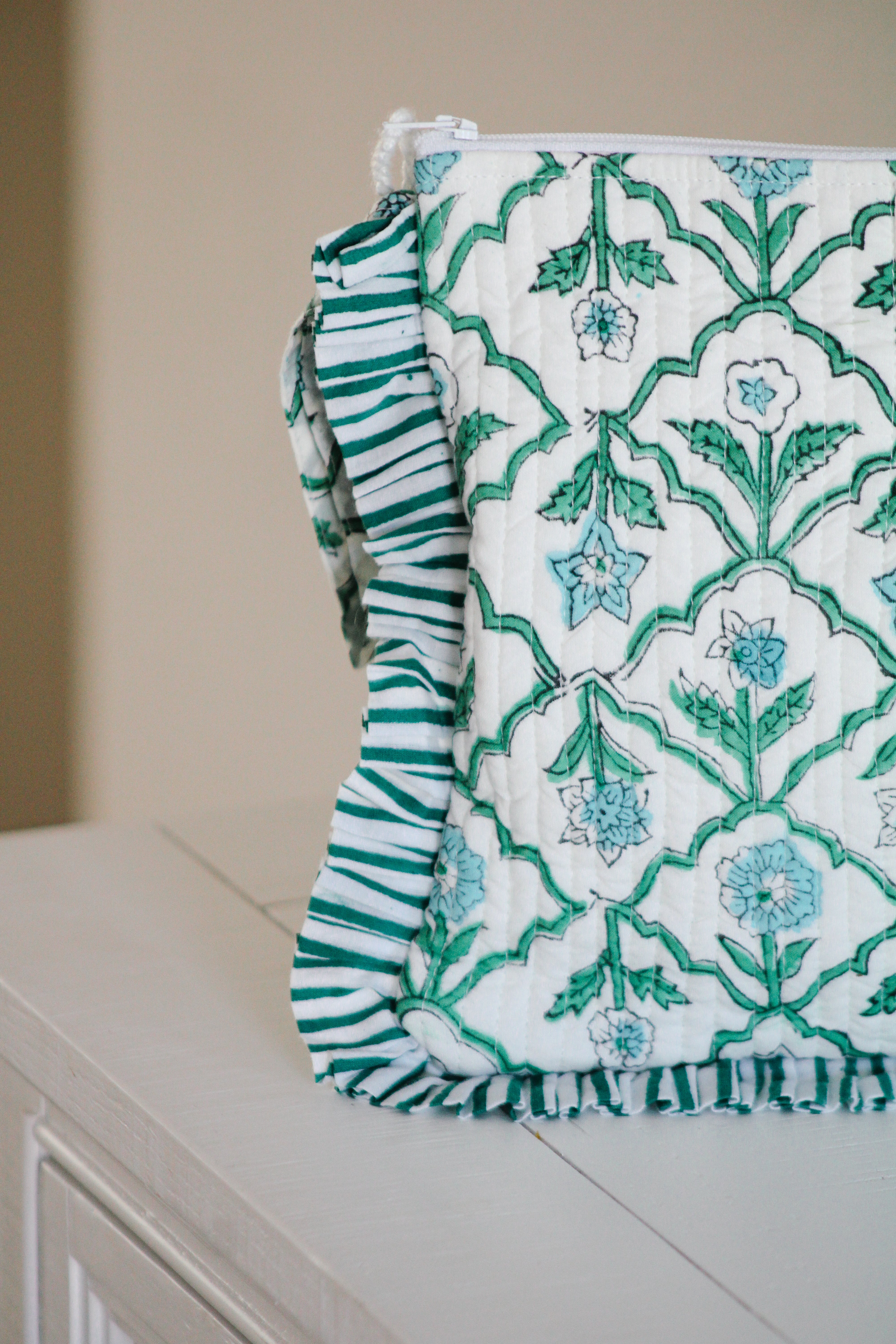 A quilted cotton pouch with sweet frill edges and a small handle for carrying. Softly structured, lined, and easy to tuck into a tote or carry on its own. Small handle located on the side.