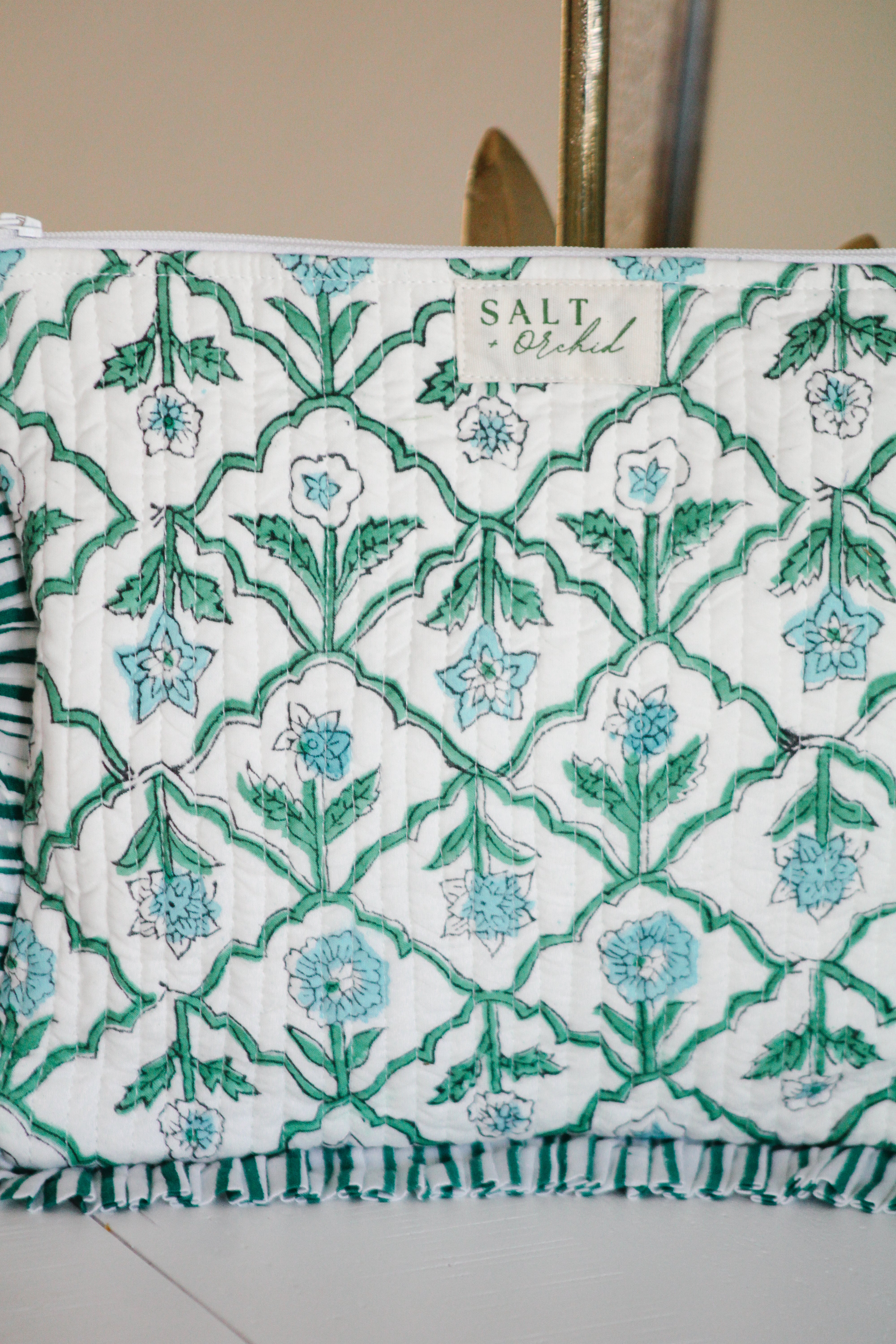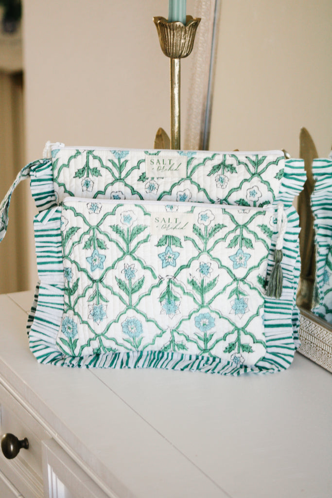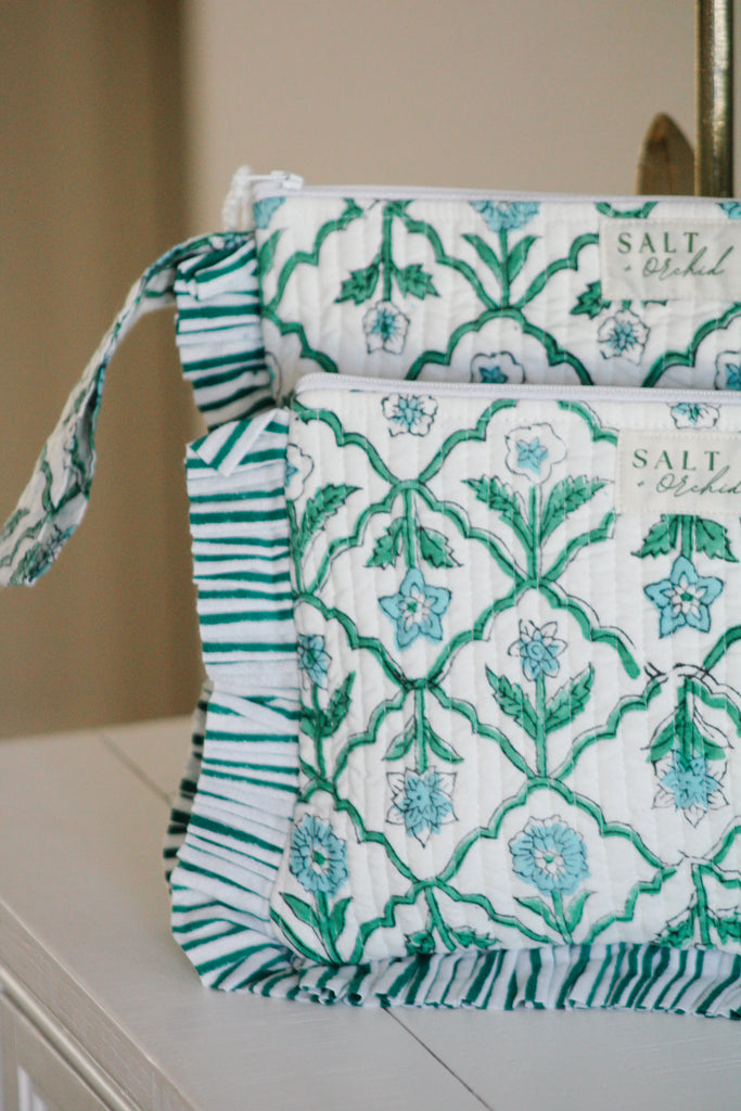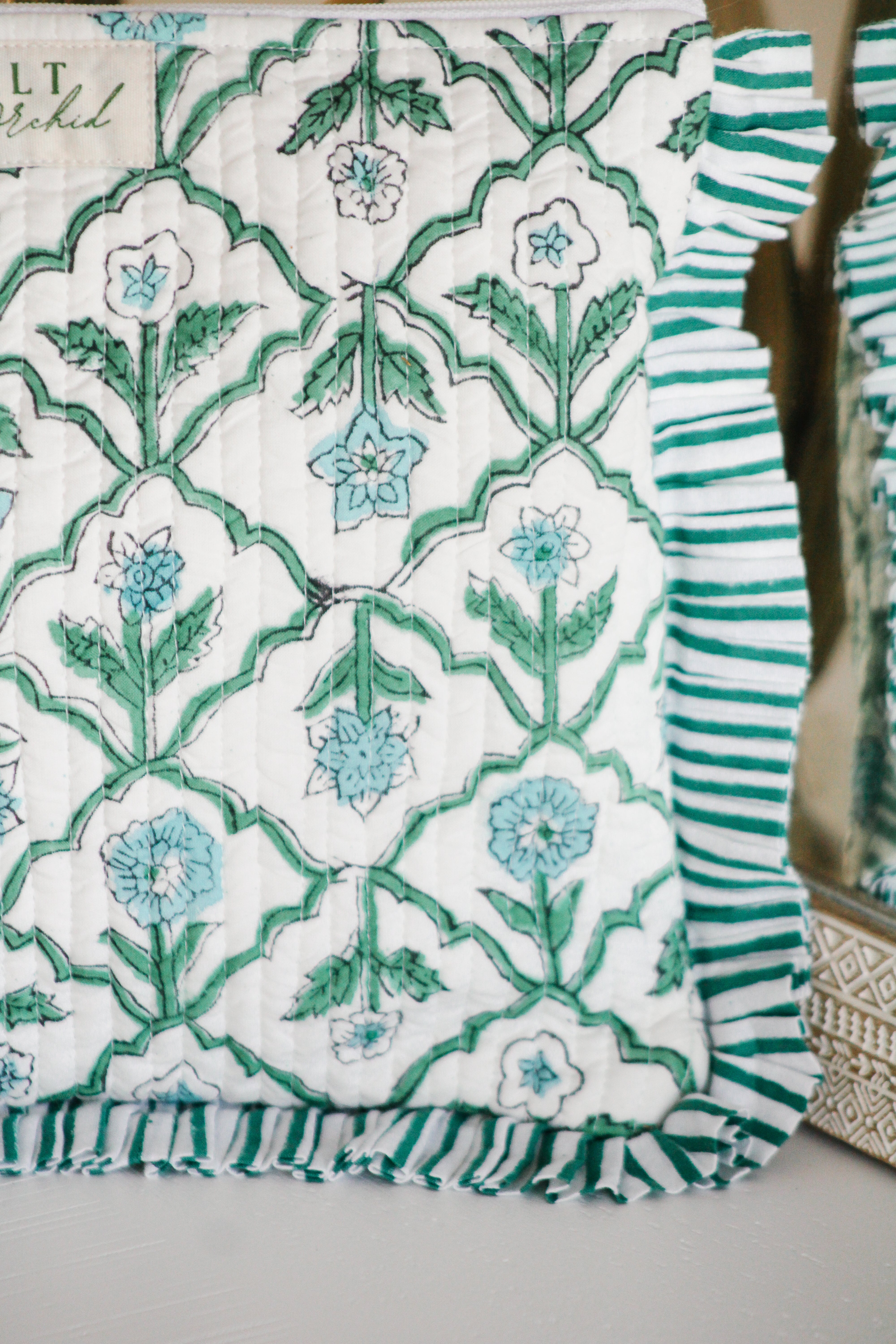 A quilted cotton pouch with sweet frill edges and a small handle for carrying. Softly structured, lined, and easy to tuck into a tote or carry on its own. Small handle located on the side.